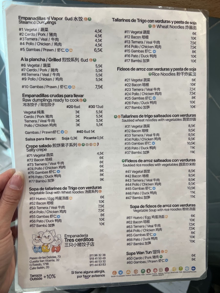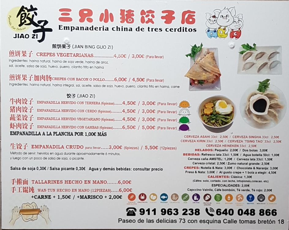 Tres Cerditos is a charming little eatery nestled in the heart of Madrid's Arganzuela district, at Paseo de las Delicias, 69. This cozy spot specializes in authentic Chinese cuisine, focusing primarily on dumplings and savory crepes that have earned rave reviews from patrons.
